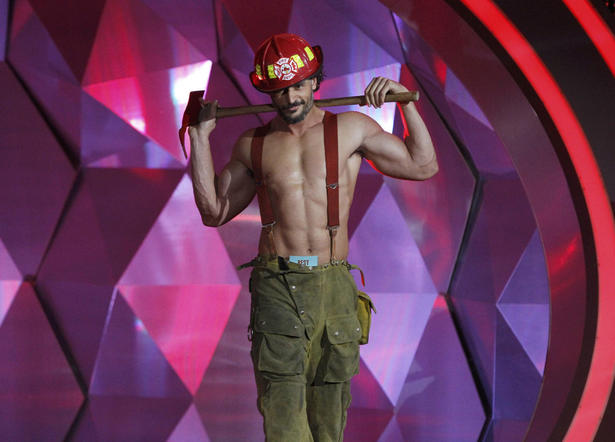 When Joe Manganiello hits the stage after working up with a vacuum cock pump, I want to not only see the results, I want to linger on them.  Instead, we get a fireman costume that would have passed muster on the Disney channel.